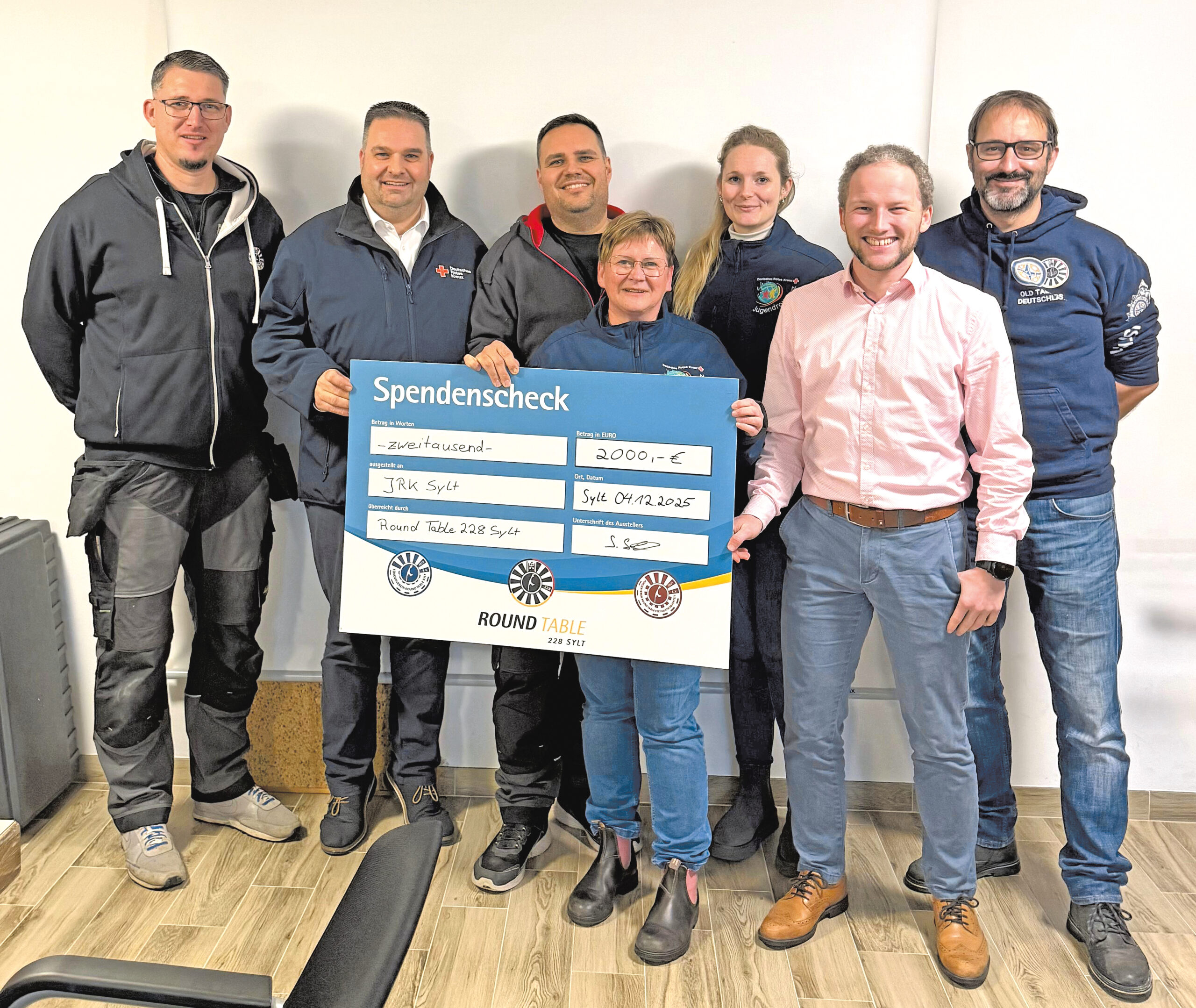 Sylt. Leif Petersen, Fabian Marten sowie Sebastian Seitz, Präsident des Round Table Sylt und Sascha van der Haar von den Old Tablers Sylt (selbst einmal Mitglied beim Jugendrotkreuz), überreichten den Scheck stellvertretend für die Sylter Tabler, die nun damit schon den 2. Scheck kurz vor Weihnachten an gemeinnützige Institutionen übergeben durften.