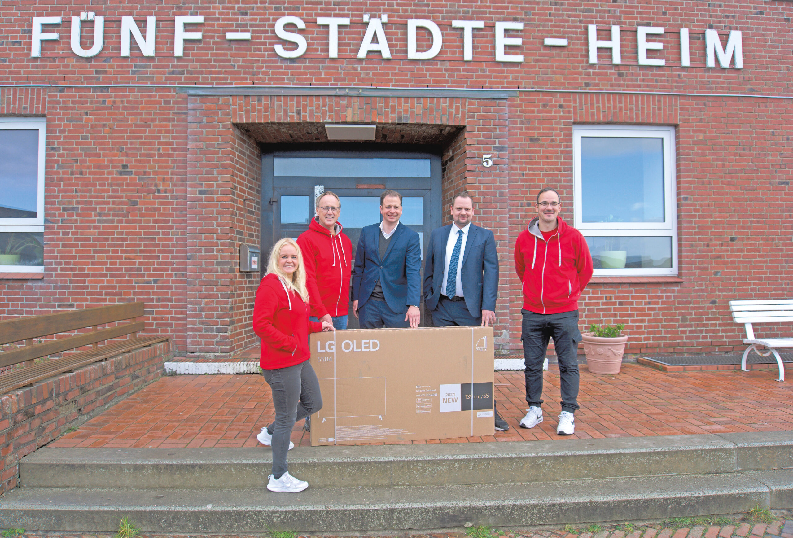 Hörnum. Große Freude im Fünf-Städte-Heim in Hörnum: Vier neue Fernseher wurden offiziell an die Hausleitung Melanie und Stefan Lübke übergeben. Die Geräte werden künftig in den Betreuerzimmern des Hauses genutzt und sind ein weiterer Schritt in der laufenden Modernisierung der traditionsreichen Jugendunterkunft am südlichen Ende der Insel. Gestiftet wurden die Fernseher vom Famila-Warenhaus in Westerland, vertreten durch Filialleiter Tobias Müller und Unternehmensinhaber Fritz Langness von der Bartels-Langness-Unternehmensgruppe. Die Spendenübergabe fand im Beisein von Elmshorns Oberbürgermeister Volker Hatje statt, der zugleich Vorsitzender des Trägervereins Fünf-Städte-Heim e. V. ist.